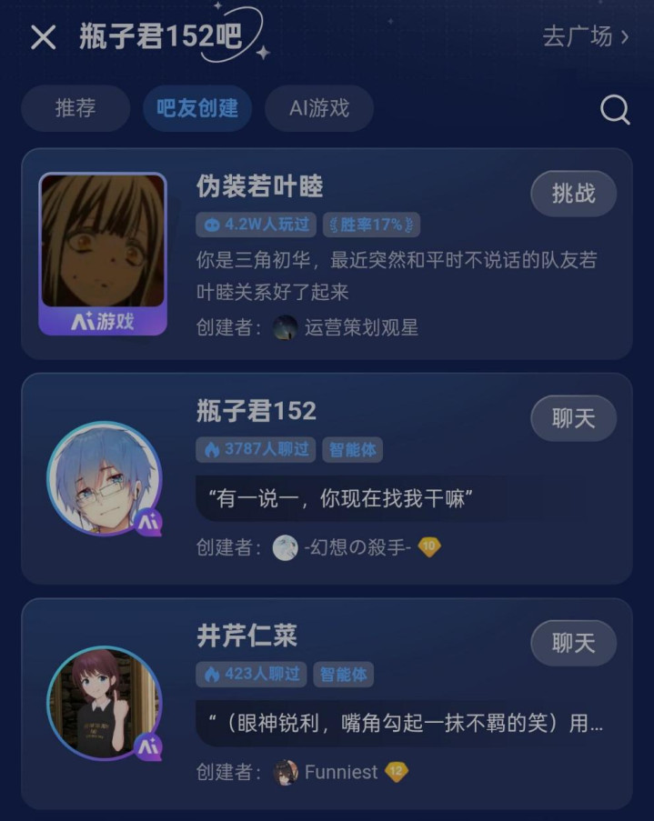 这两年我们其实也聊过AI陪聊的事。比如去年短暂泛滥过一阵、可以直接拉进群聊使用的 QQ 智能体;再比如贴吧至今还挂在页面顶端的机器人;以及各种对话式小游戏,都是AI陪聊的一部分。
