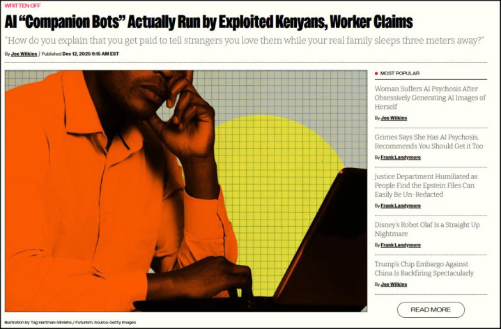 前段时间,一个主要做新兴技术新闻的网站Futurism,刊载了一篇很有意思的报道。标题是《员工声称:AI“陪伴机器人”实际上由被剥削的肯尼亚人运作》。