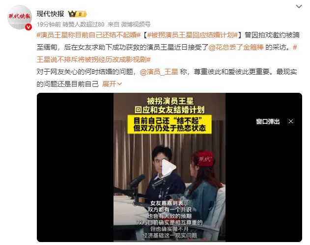 近日,演员王星在接受专访时的一番走心发言引发全网热议!这位曾因拍戏邀约被骗至缅甸妙瓦底电诈园区的演员,首度袒露获救后的生活近况,直言当下经济条件还不足以支撑婚姻,“结不起婚是实话,不想让爱人跟着我风餐露宿”;同时他也松口,不排斥将这段惊心动魄的被拐经历改编成影视作品,前提是坚守正向调性、不消费苦难,只想给更多人敲响警钟。